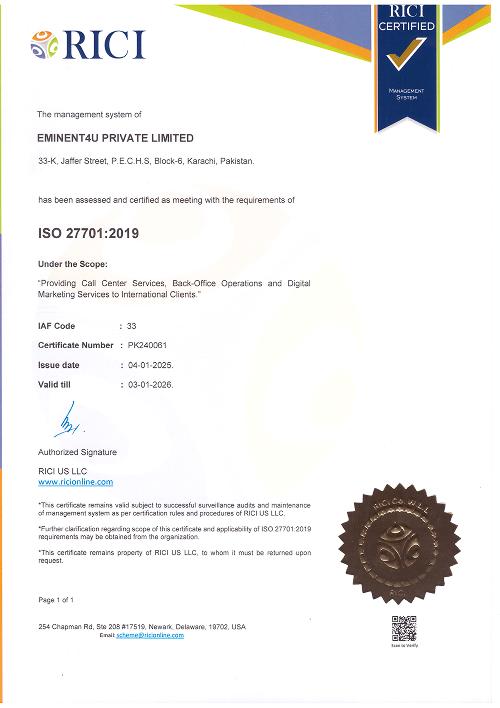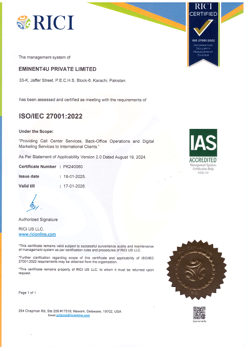 The ISO 27001: 2022 certification is a globally recognized standard that outlines the requirements for establishing, implementing, maintaining, and continually improving an information security management system (ISMS). By obtaining this certification, Eminent4U demonstrates its dedication to safeguarding sensitive information and assets.